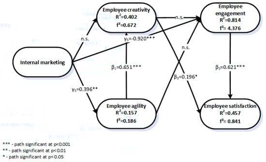 The next step involved testing the structural model, which included the addition of IM as a second-order factor with three indicators: internal communication, motivation, and training. The Second-order IM factor was calculated using the latent scores. This model also integrated other constructs from the conceptual model and hypotheses: employee satisfaction, creativity, engagement, and agility. The measurement model showed an appropriate fit with respect to the following fit indices: χ2/df = 1.522 (p < 0.05), CFI = 0.911, RMR = 0.040, RMSEA = 0.077, IFI = 0.910, and TLI = 0.893. It is worth noting that the χ2 value was significant, indicating a less-than-perfect fit. However, this index is known to be highly sensitive to the small sample size. Additional evaluation with other indices showed that they were within the suggested thresholds, except TLI, which was slightly below 0.9.
