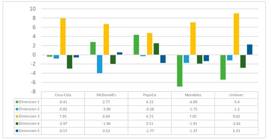 Comparison of mean dimension scores across the five companies (Coca-Cola, McDonald’s, PepsiCo, Mondelez, and Unilever).