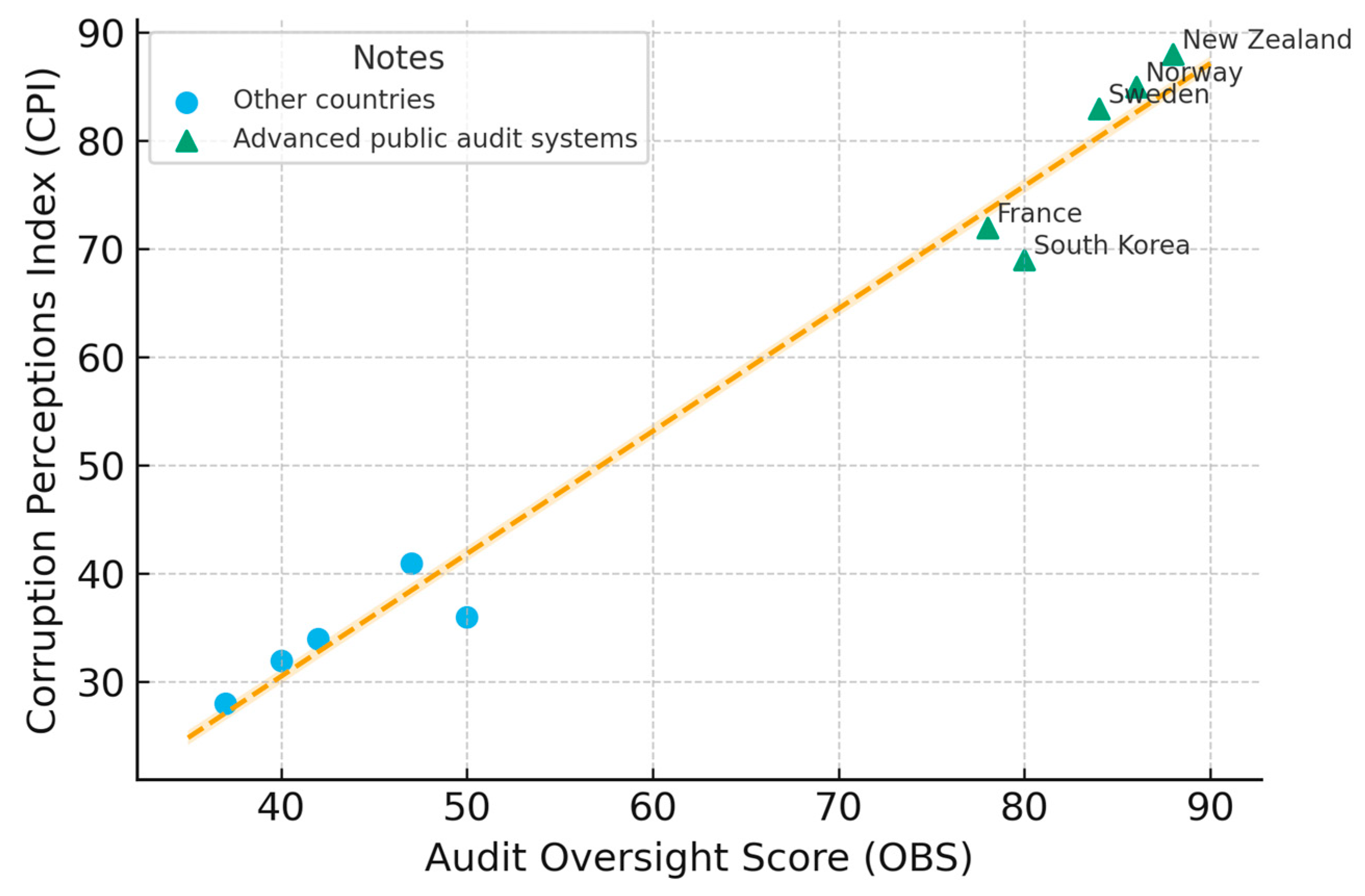 To illustrate the correlation, we analyzed the relationship between Open Budget Survey (OBS) oversight scores and Transparency International’s Corruption Perceptions Index (CPI) for 50 countries included in both datasets. The Pearson correlation coefficient was strongly positive (approximately r ≈ 0.7), indicating that countries with stronger audit and oversight frameworks tend to also demonstrate better corruption outcomes (higher CPI scores). A similarly positive relationship exists between oversight scores and the World Bank’s Government Effectiveness indicator (r ≈ 0.67). While correlation does not imply causation, the results support the hypothesis that countries investing in strong audit institutions typically maintain higher overall governance quality (