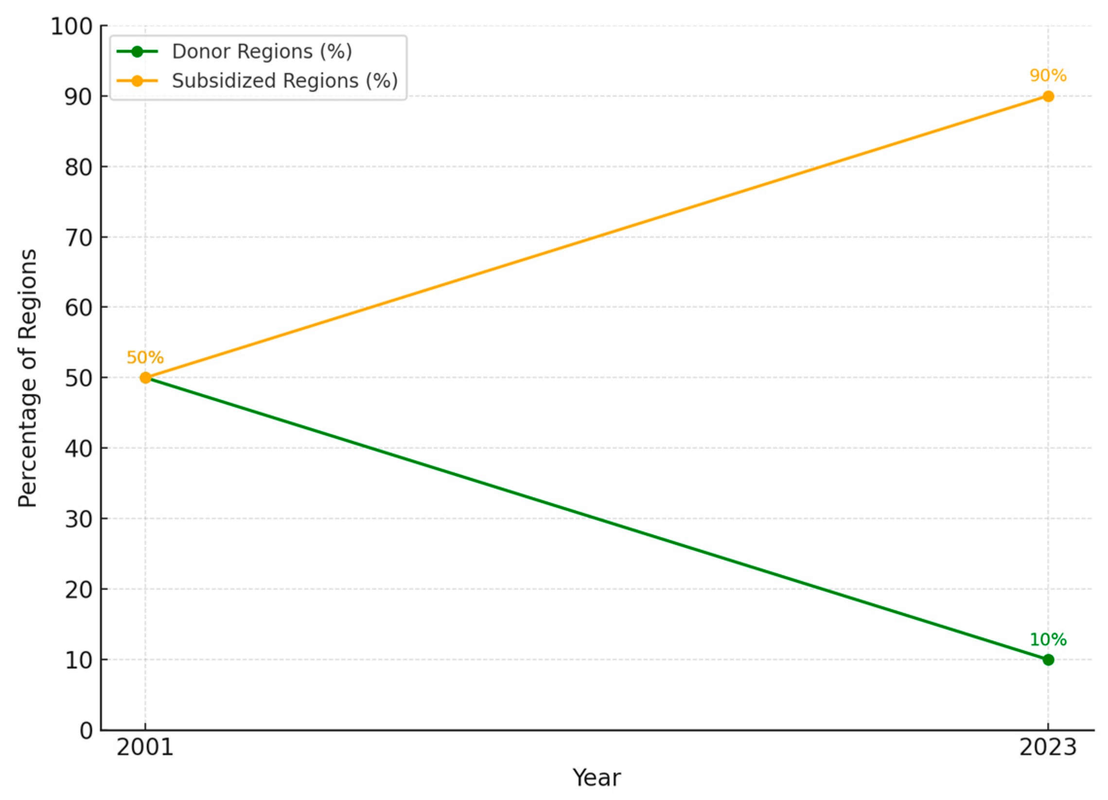 Figure 2 illustrates this trend, showing how the proportion of donor regions declined from 50% to 10% over the period, reflecting increasing fiscal imbalance.