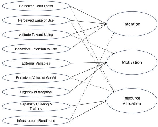 Using thematic analysis (Braun & Clarke, 2006), recurring topics were classified within the study’s theoretical framework. The key categories identified include Perceived Usefulness, Perceived Ease of Use, Attitude Toward Using, Behavioral Intention to Use, External Variables, Perceived Value of GenAI, Urgency of Adoption, Capability Building and Training, and Infrastructure Readiness. Figure 2 illustrates the nine categories and their relationship with the three main themes: Intention, Motivation, and Resource Allocation. As organizations function as complex systems (Anderson, 1999), several categories influence more than one theme, reflecting the interconnected nature of AI adoption. Solid lines indicate primary relationships, while dashed lines represent indirect influences, underscoring the dynamic and interdependent nature of decision-making. In line with recent literature, these interdependencies also reflect processes of mutual causality among technology adoption constructs, motivational mechanisms, and resource-based conditions (Venkatesh & Bala, 2008; Chau & Hu, 2002; Pfister & Lehmann, 2022). Motivation can shape perceptions of usefulness and ease of use, just as these perceptions can enhance or inhibit motivation; similarly, resource strategies influence motivational readiness and are themselves shaped by evolving adoption practices. Such reciprocal interactions highlight that linear models are insufficient for explaining adoption dynamics in contexts characterised by digital transformation and disruptive technologies, reinforcing the need for a complexity-informed interpretation of the data.