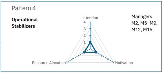Pattern 4: Operational Stabilizers. These leaders follow a fully adaptive approach. They do not prioritize GenAI as a driver of change; instead, they focus on maintaining operational efficiency with minimal disruption. Figure 6 represents a configuration dominated by adaptive intention, low motivation, and minimal resource allocation. Although similar to late adopters, their inertia is driven less by resistance and more by path dependence and reinforcing loops: low perceived usefulness reduces motivation to invest, limited investment depresses IT readiness, and low readiness confirms leaders’ initial perceptions (García-Madurga & Grilló-Méndez, 2023). Complexity theory frames this as a low-change attractor, where small interventions have limited effect unless accompanied by external shocks or significant structural support.