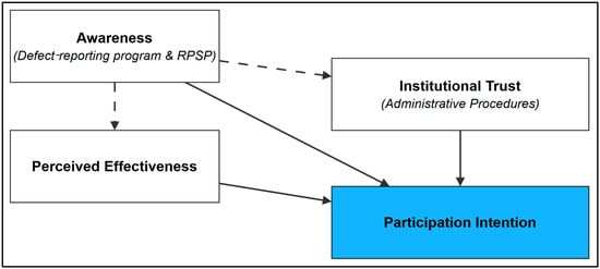 Based on the theoretical foundations discussed, this study conceptualizes that residents’ participation intention. These factors are (1) awareness of the programs, (2) perceived effectiveness of these programs, and (3) institutional trust in the administrative procedures that manage them. These relationships are illustrated in the conceptual framework below (Figure 1).