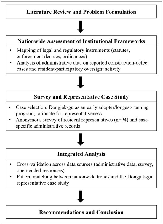 First, to examine the current state of the implementation gap in resident-participation schemes for defective construction prevention (RQ1), relevant ordinances and administrative performance records will be analyzed using descriptive statistics. Second, to assess residents’ awareness and experiences (RQ2), this study conducts a survey of resident representatives, measuring awareness, perceived effectiveness, and related factors through descriptive statistics and factor analysis. Finally, to identify the key determinants of residents’ intention to participate and explore policy alternatives (RQ3), major variables are derived from the survey analysis, and a qualitative thematic analysis of open-ended responses will be carried out to examine barriers and improvement needs in depth.