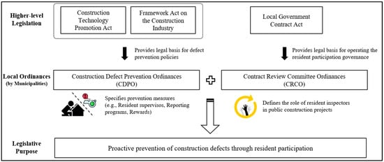 Higher-level legislation, such as the Local Contract Act and the Framework Act on the Construction Industry, provides the legal basis for two main types of local ordinances: CDPOs and Contract Review Committee Ordinances (CRCOs). Both streams of ordinances are designed to work toward the ultimate legislative purpose of proactively preventing construction defects through resident participation. One key program is the Resident Participation Supervision Program (RPSP), which involves residents with expertise who visit construction sites and inspect the construction process. The Enforcement Decree of the Local Contract Act (Korea Legislation Research Institute, 2023) includes the roles and administrative elements of resident supervisors.