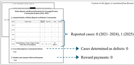 However, in contrast to the widespread enactment of CDPOs, the actual implementation performance of the scheme is considerably low, indicating a significant gap between the intention of institutional design and implementation performance. An analysis of defect-reporting records and reward disbursement records from 10 major local governments revealed that most local governments had no records or very few, with eight locations—Incheon Metropolitan City, Gyeongsangbuk-do, Gyeongsangnam-do, Seoul Nowon-gu, Jeollanam-do, Paju, Gwangju Metropolitan City, and Busan Metropolitan City—possessing no records during the period. Gyeonggi-do made one report in 2025, but it did not lead to defect processing (Figure 5), and Bucheon City had only one case out of six reports judged a defect, with no reward disbursements, signifying that the resident reporting and reward program is virtually inactive. This pattern illustrates the implementation gap, indicating that legal policies alone have not yet translated into active operation of the schemes.