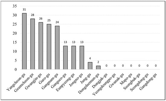 The operational status of the RPSP revealed similar problems. Figure 6 displays the number of supervised cases by district in Seoul, indicating that most autonomous districts—except for a few such as Yangcheon-gu and Geumcheon-gu—recorded very limited or no activity. Moreover, an analysis of performance data from 20 local governments revealed that the resident participation scheme was not being properly implemented, with nine local governments, including the Seoul Metropolitan Government headquarters, possessing no operational records. Meanwhile, the activities of the 11 local governments that reported performance were centered on facilities closely related to daily life, such as roads, parks, and landscaping, with activities surveyed being mainly site tidying or safety inspections. This is far from the original purpose of inspecting construction defects in large-scale construction or infrastructure facilities. This trend indicates both a quantitative gap in participation levels and a qualitative gap in implementation focus, pointing to a misalignment between the scheme’s policy intent and its actual field application.