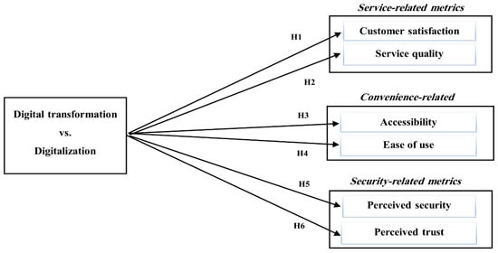 Hence, this study makes several contributions to the existing knowledge on digital transformation: First, it thoroughly evaluates prior research to identify the critical outcome metrics for the success of government digital services. Second, this study assesses how users evaluate these services according to these metrics and examines any significant differences between digital transformation and digitalisation services. Finally, this study proposes a model that encompasses six metrics, divided into three domains: service-related (user satisfaction and service quality), convenience-related (accessibility and ease of use), and security-related (perceived security and perceived trust). Previous research has overlooked these metrics and rarely examined them in a unified model.