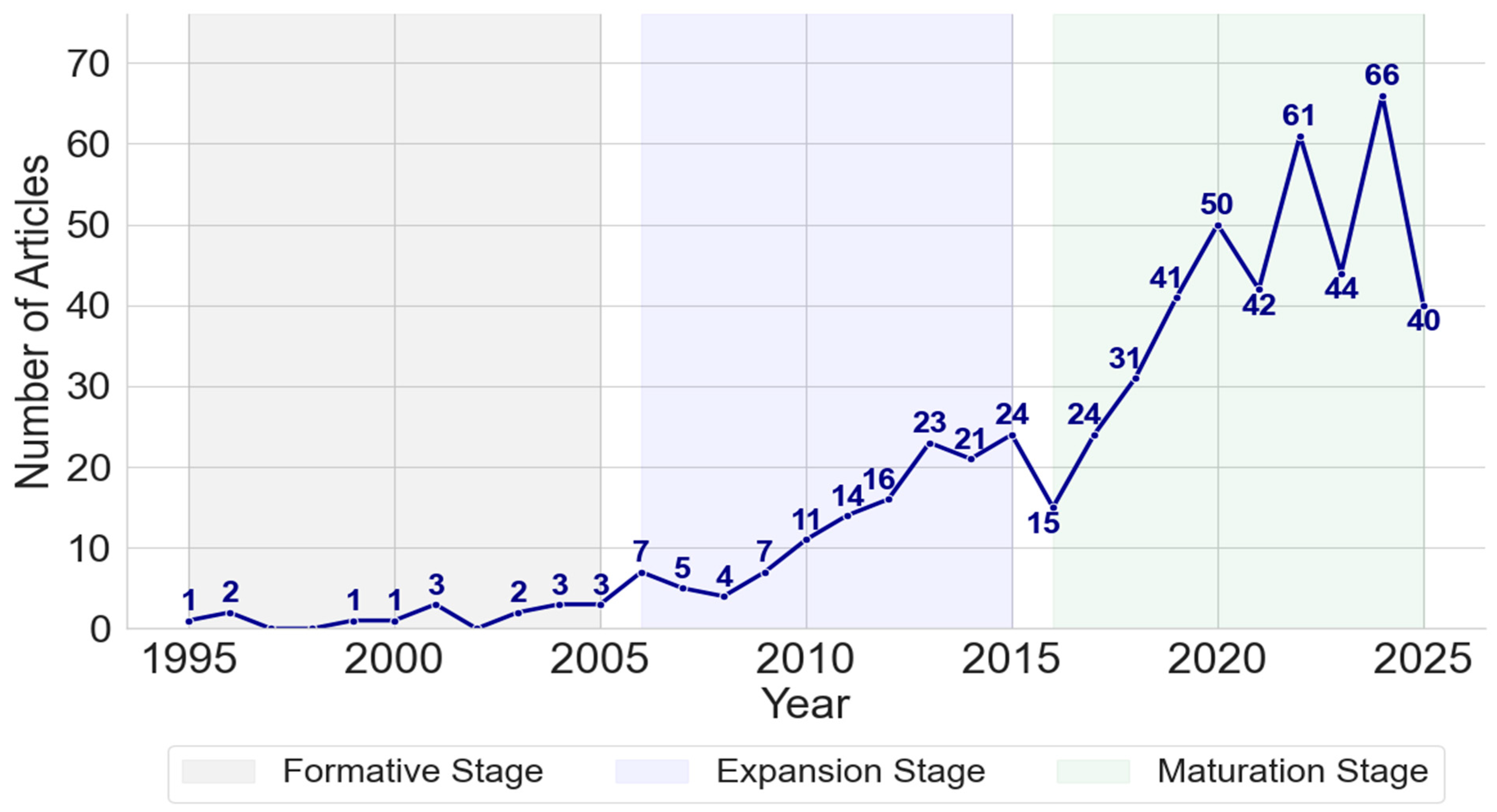 In the expansion stage (2006–2015), research output increased steadily, rising from 7 publications in 2006 to 24 in 2015, with a notable milestone of 11 publications in 2010—over three times the average of the previous decade.