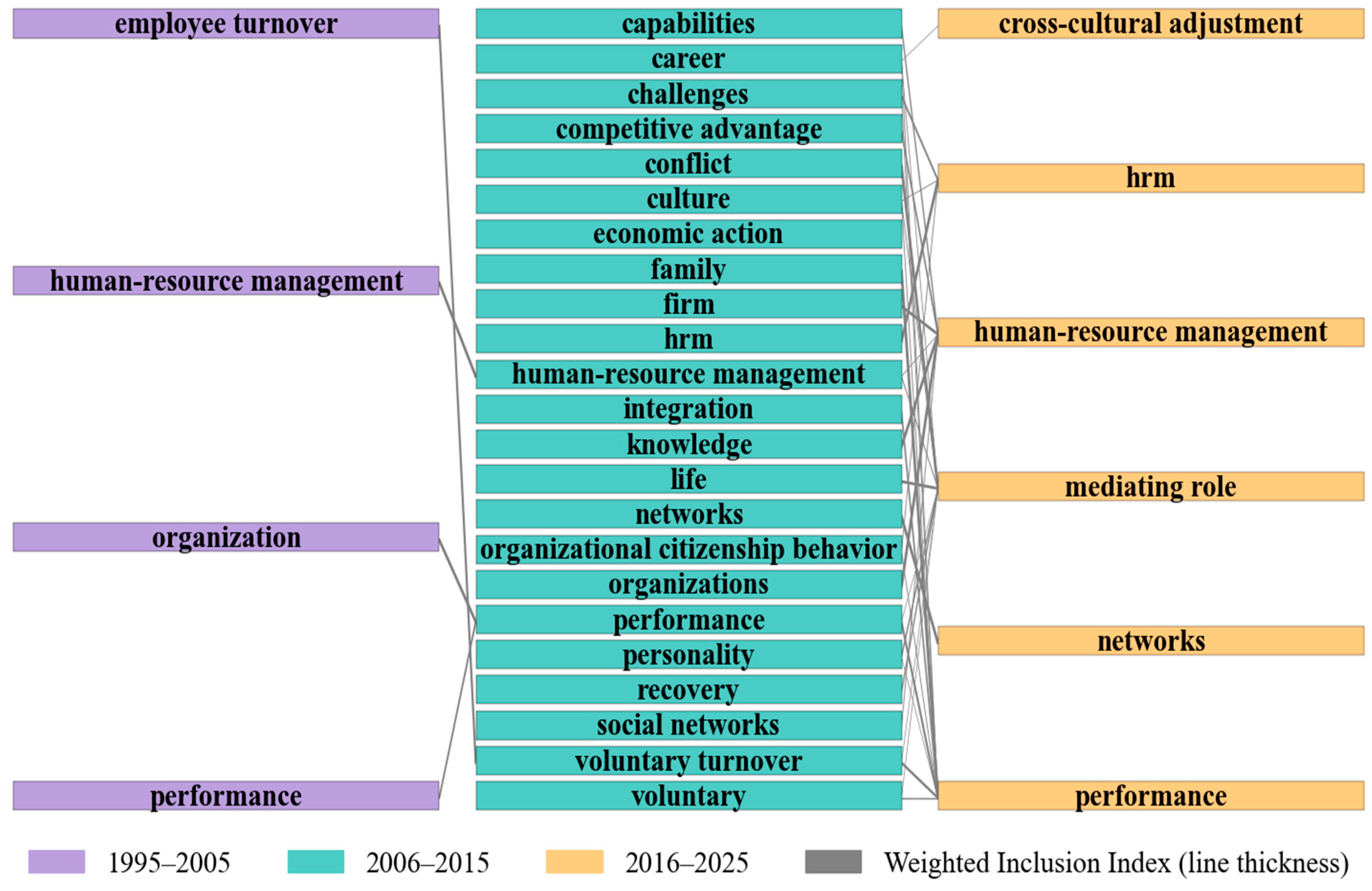 In the maturation stage, research shifted toward mechanisms and boundary conditions, with emerging themes such as “mediating role,” “cross-cultural adjustment,” “networks.” Notably, “performance” re-emerged as a central node, reflecting its integration into complex, multi-path models of HRM outcomes. Thematic evolution across the three stages demonstrates progressive intellectual development—from early conceptual exploration, through interdisciplinary expansion, to theoretical refinement and contextual nuance.