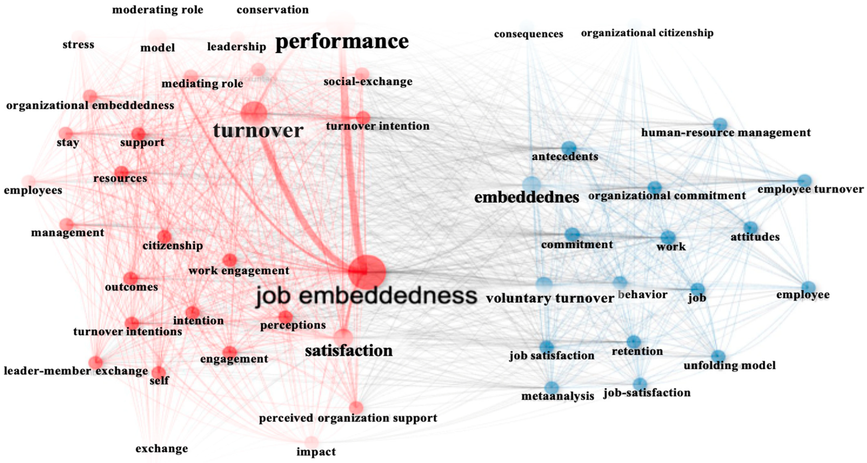 Cluster 2, in contrast, aligns with a macro-organizational orientation, comprising terms such as organizational commitment, human resource management, and meta-analysis. While centrality metrics are lower, the inclusion of organizational citizenship behavior, person–organization fit, and strategic HR outcomes illustrates the integration of embeddedness theory into broader institutional frameworks. Notably, cluster 2 provides a complementary lens to cluster 1, suggesting that micro-level embeddedness mechanisms may aggregate or interact to produce macro-level organizational outcomes.