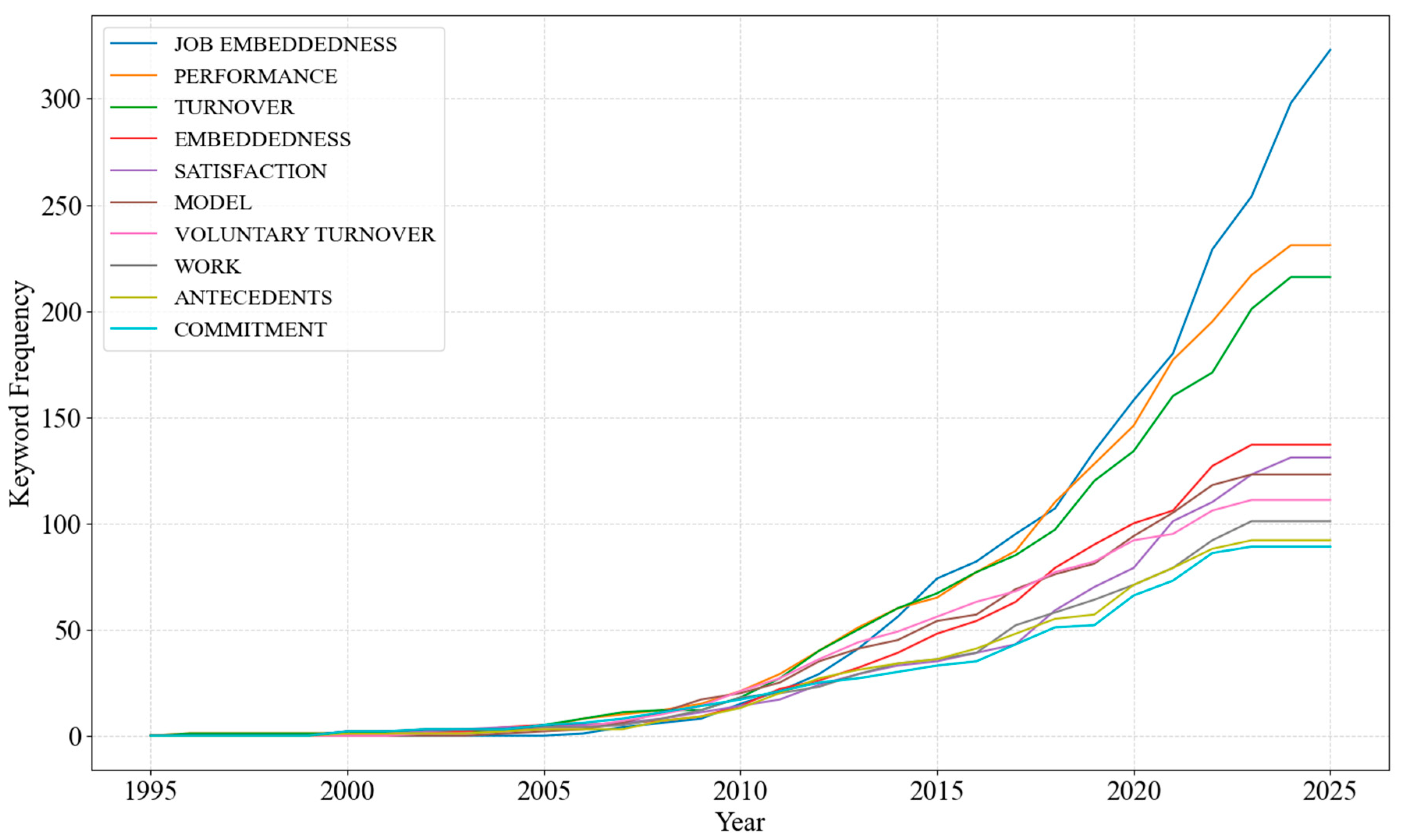 Figure 9 presents the longitudinal frequency trends of selected high-impact keywords, including job embeddedness, turnover, performance, satisfaction, and voluntary turnover. The data indicate a clear acceleration of interest in job embeddedness and embeddedness from the early 2010s, with peak frequencies occurring around 2023, reflecting the increasing centrality of these constructs in contemporary HRM research. Traditional HR constructs, such as turnover and job satisfaction, maintain relatively stable usage across the three-decade period, highlighting their enduring theoretical and practical relevance. The co-existence of emerging and foundational terms suggests that the field is simultaneously consolidating established HRM knowledge while integrating novel constructs that respond to evolving organizational and technological contexts.