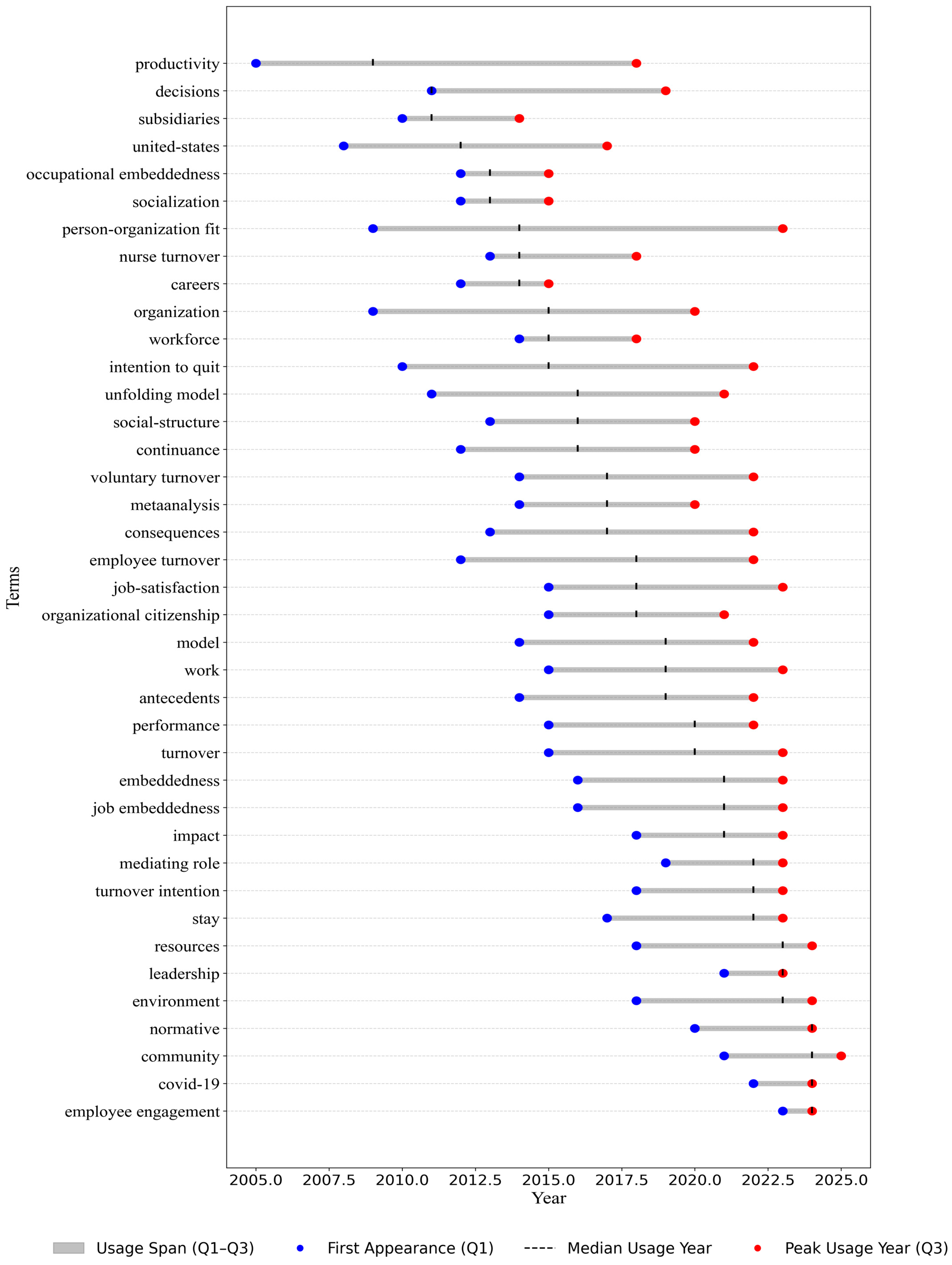Figure 10 provides a complementary perspective by depicting the temporal span of term usage through interquartile ranges (Q1–Q3) and median usage years. This visualization elucidates the adoption patterns of both classical and contemporary keywords. For instance, person-organization fit and organizational citizenship exhibit a broad temporal span from the late 2000s to 2023, signaling sustained scholarly attention. In contrast, keywords associated with contemporary work modalities, including employee engagement, remote work, and digital tools, emerge primarily post-2016, corresponding to technological transformations and the increasing prevalence of hybrid work arrangements. These patterns underscore the field’s responsiveness to contextual shifts and the integration of emergent phenomena alongside foundational constructs.