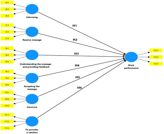 The analysis of the structural model, as shown in Figure 2, highlights the interdependent relationships between Informing (I), Receiving the message (RM), Understanding the message and providing feedback (UMSF), Accepting the message (AM), Convincing (C), Provoking a reaction (PR), and Work performance (WP). The R2 coefficient of 0.570 for Work performance (WP) indicates that a significant percentage of the variation in this factor is explained by Informing (I), Receiving the message (RM), Understanding the message and providing feedback (UMSF), Accepting the message (AM), Convincing (C), and Provoking a reaction (PR).