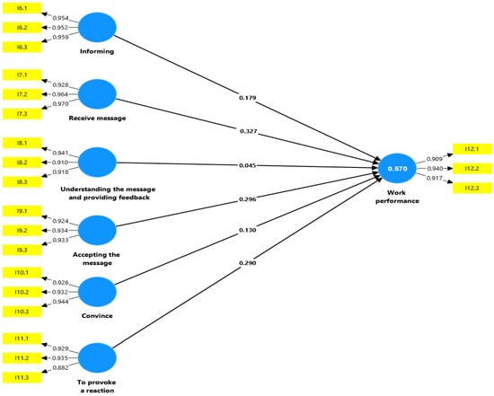 Table 2 reveals remarkable consistency and validity in measuring the investigated aspects. The construct “Informing” is marked by factor loadings between 0.952 and 0.959, with a CR of 0.953 and an AVE of 0.912, indicating excellent convergent validity. The construct “Receive message” shows factor loadings from 0.928 to 0.970, with a CR of 0.962 and an AVE of 0.910, confirming its adequate measurement. The construct “Understanding the message and providing feedback” is characterized by factor loadings ranging between 0.910 and 0.941, with a CR of 0.949 and an AVE of 0.852, indicating significant reliability. The construct “Accepting the message” presents factor loadings between 0.924 and 0.934, with a CR of 0.923 and an AVE of 0.865, while the construct “Convince” has values from 0.926 to 0.944, with a CR of 0.928 and an AVE of 0.873. Lastly, the construct “To provoke a reaction” shows factor loadings between 0.882 and 0.935, with a CR of 0.909 and an AVE of 0.839, whereas the construct “Work performance” has factor loadings between 0.909 and 0.940, with a CR of 0.912 and an AVE of 0.850, confirming good consistency and validity throughout the study.