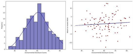 Figure 1 shows how banking sector environmental disclosure scores affect financial performance. Representative banks’ transparency and sustainability reporting is shown by environmental disclosure score dispersion. Most banks score mid-to-high, showing that while many have embraced environmental disclosure policies, a portion still lags, presumably reflecting industry flexibility or commitment to sustainability reporting. This distribution suggests environmental openness, although certain organizations may need government or market incentives to disclose more. A scatter plot shows how environmental disclosure scores affect ROA. Banks with greater environmental disclosure scores do better financially. Sustainability reporting improves stakeholder trust, risk management, and attractiveness to environmentally conscious investors, which may help banks financially. Such findings suggest that banks that excel in environmental disclosure may gain market favor. Environmental openness boosts profits, boosting sustainability’s commercial argument.