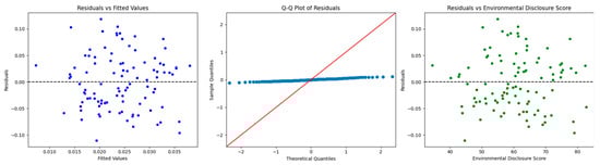 Figure 2. Residuals vs. fitted values tests homoscedasticity, which requires constant residual variance across fitted values. The model meets homoscedasticity because the residuals are randomly distributed around zero. Small clustering may suggest minor abnormalities, but not enough to worry about. A Q-Q (quantile–quantile) plot of residuals evaluates residual normality for regression hypothesis testing. These plots indicate that residuals follow the red line, indicating a normal distribution. The tails deviate, but the alignment supports the assumption of normalcy, making the model’s inference tests reliable. The final figure, residuals vs. environmental disclosure score, examines the relationship. The plot reveals no trend, supporting the model’s premise that residuals are independent of environmental disclosure score. These diagnostics show that the panel data regression model is well fitted and fits key assumptions, making the results interpretable.
