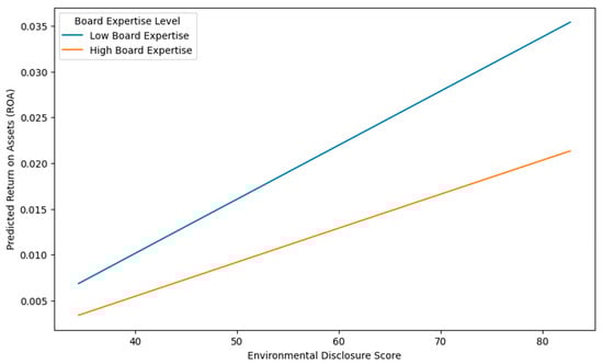 Figure 3 shows how environmental disclosure score and board environmental expertise affect predicted ROA. The blue line shows banks with low board environmental competency, whereas the orange line shows excellent board expertise. Better environmental disclosure ratings anticipate better ROA. Board environmental competence moderates high slopes. Banks with little board environmental understanding have a stronger relationship between environmental disclosure and financial performance. Environmental disclosure raises ROA more in banks without environmental professionals. Environmental disclosure affects financial success less for banks with high board environmental understanding, as the slope is flatter. Environmental disclosure usually boosts financial success, but the board’s competency may matter. Environmental transparency may increase stakeholder trust and reduce information asymmetry in institutions with little environmental expertise. For banks with more board knowledge, transparency slightly boosts ROA due to a baseline level of trust or efficiency. Disclosure policies and board composition are crucial to understanding sustainability-related financial results.