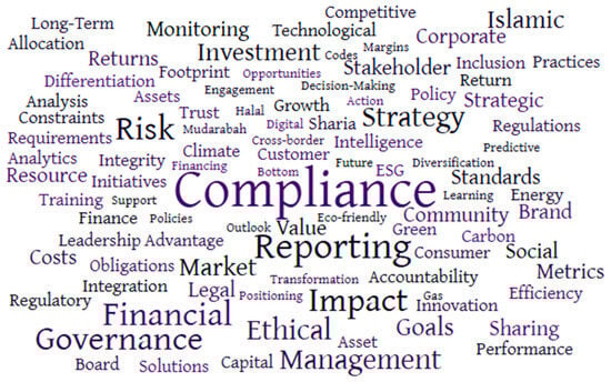 Figure 4 presents the primary themes of qualitative analysis and concepts on banking sector corporate governance, environmental disclosure, and sustainable financing as a word cloud. Sustainability and financial performance arguments center on compliance, reporting, risk, impact, and governance. Compliance and reporting suggests banks promote environmental and financial transparency and regulatory compliance owing to shareholder and regulatory accountability. Risk, financial, and management emphasize environmental and financial risk management, reflecting banks’ struggle to reconcile profitability and sustainability. Ethics, strategy, community, and stakeholder highlight the social and ethical dimensions of sustainable finance in addition to compliance, showing that banks are meeting community expectations and stakeholder interests. Market value and competitive advantage highlight the financial and market benefits of sustainable practices, whereas innovation, efficiency, and standards emphasize efficient, innovative means to achieve sustainability goals. The word cloud demonstrates that banks are increasingly prioritizing ethical governance, regulatory compliance, risk management, and strategic sustainability investment for financial stability and competitiveness.
