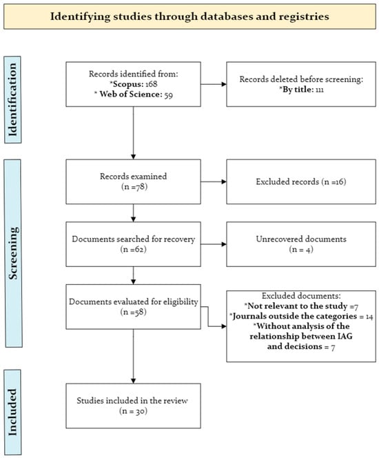 As shown in Figure 1, 227 articles were initially identified through searches of various academic databases. During the initial screening phase, 149 articles were discarded based on their titles’ relevance and duplicates’ elimination. In the full-text screening phase, 16 additional articles were excluded as they did not meet the established inclusion criteria. The screening process resulted in a total of 30 articles, as 28 were excluded as they did not contain information relevant to the review.