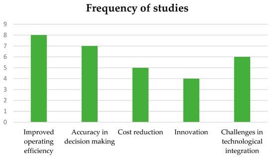 The data extracted from each of the articles presented in Table A1 show the potential of artificial intelligence (AI) in various business sectors. Of the 30 articles analyzed, 27 reported improvements in operational efficiency. Eight studies (A1, A2, A6, A10, A11, A19, A21, and A30) highlighted process optimization and productivity gains as significant advantages of GAI, especially in manufacturing and healthcare. Seven studies (A3, A4, A5, A5, A9, A12, A17, and A23) demonstrated that this technology increases the reliability of strategic and operational decision-making when handling large volumes of data if human judgment is present. On the other hand, five studies (A6, A10, A17, A19, and A21) pointed out that cost reduction due to the elimination of repetitive processes is a significant advantage.