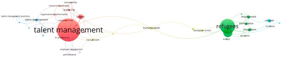 The keywords were an essential factor when searching through the literature on talent management and its use as a tool for the integration of refugees in their host countries. Through the bibliometric analysis of VOSviewer, we created a map based on the bibliographic data (Figure 3) with the coexistence of the keywords of research that has been conducted for the reference years 2018–2023. We relied on the data we collected from the reference manager files, and with a minimum number of occurrences of two keywords, 35 papers were selected regarding this research out of 42 in total.