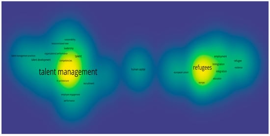 The thematic map in Figure 4 highlights two primary research themes: talent management and refugees. The most prominent theme centers around talent management, particularly its role in the recruitment, development, and retention of human resources. Additionally, two smaller, yet significant themes—refugees and immigration—are emphasized in Figure 3, with the studies in these areas focusing on the integration and employment of refugees in European Union host countries. A closer look at the map shows that these themes are interlinked through the concept of human capital development within the European Union (Figure 3). Interestingly, the intersection of talent management with immigration is relatively unexplored, highlighting a promising avenue for future research in the field.
