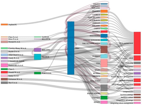 The middle section (countries) displays the country affiliations of these researchers, while the “Other” category represents a collection of countries that are not listed individually.