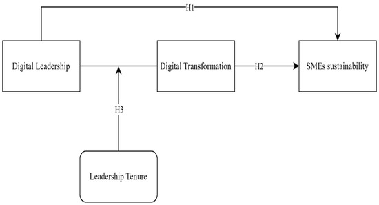 In this section, the study discusses the constructs’ theoretical understanding and proposes the hypothesis shown in Figure 1. Research is supported by dynamic capability theory, which suggests that firms must be able to sense, seize, and reconfigure resources and competencies in response to changing market conditions to achieve sustainable competitive advantage (Rehman et al., 2025). In other words, dynamic capability theory argues that organizations, irrespective of their size and hierarchical structure, must adapt to environmental requirements. For this, it is essential to grasp the opportunities arising from changing market conditions so that the operations are sustainable, and it helps organizations to take a substantial lead from their competitors. Additionally, leaders and managers are essential in overcoming resistance (Chahal, 2025). With respect to digital leadership, the potential capability of SMEs is considered, with digital leaders playing a significant role in sensing opportunities to utilize advanced digital technologies (Li et al., 2016). With technological advancement, thriving leaders are those who are equally competent on digital platforms. The trends are visible that SMEs often rely on digital platforms to enhance the visibility of their operations. Thus, the digital role of leaders further escalates in the modern paradigm in the race to ensure competition through sustainability. Furthermore, digital transformation is a crucial capability because it equips SMEs with the latest technology structures to analyze new market trends and environmental changes, thereby further configuring resources to sustain the performance of SMEs overall (Ulaş, 2019). Leadership tenure, as crucial experience, is considered an important capability for SMEs; experienced leaders can make the right decisions in drastic situations because they have a sufficient understanding of the organization and its potential market (Fernández-Mesa et al., 2013; Koryak et al., 2015). Leadership styles have a distinct impact on project success (H. Kaur et al., 2024). However, there is no conclusive evidence that distinct leadership styles using digital platforms are equally successful in varying sectors. This further increases the essentiality of using dynamic capability theory. Hence, in simple words, DCT is the backbone of understanding this study’s research framework mechanism.