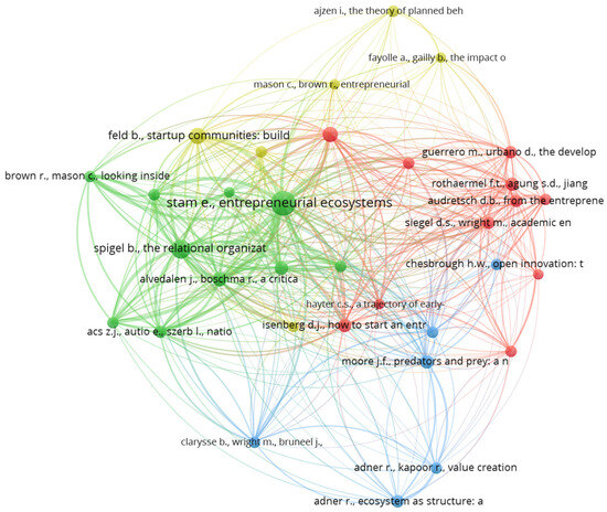Co-citation network visualization: Cluster 1 (Red): Entrepreneurial universities and innovation ecosystems. References: Audretsch (2014); Autio et al. (2014); Etzkowitz (2008); Etzkowitz et al. (2000); Etzkowitz and Leydesdorff (2000); Guerrero et al. (2016); Guerrero and Urbano (2012); Hayter (2016); Rothaermel et al. (2007); Siegel and Wright (2015). Cluster 2 (Green): Entrepreneurial ecosystems and regional innovation. References: Ács et al. (2014); Acs et al. (2017); Alvedalen and Boschma (2017); Brown and Mason (2017); Cohen (2006); Mack and Mayer (2016); Miller and Acs (2017); Spigel (2017); Spigel and Harrison (2018); Stam (2015). Cluster 3 (Blue): Business strategy and innovation ecosystems. References: Adner (2017); Adner and Kapoor (2010); Chesbrough and Teece (2002); Clarysse et al. (2014); Eisenhardt (1989); Moore (1993). Cluster 4 (Yellow): Sustaining Entrepreneurial Ecosystems. References: Ajzen (1991); Fayolle and Gailly (2015); Feld (2015); Isenberg (2011); Mason and Brown (2014); Shane and Venkataraman (2000).