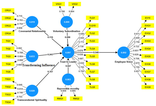 PLS with the AVE values (own study). Note: VS = Voluntary Subordination, CR = Covenantal Relationship, TI = Transforming Influence, RM = Responsible Morality, TS = Transcendental Spirituality, TL = Trust in Leader, EV = Employee Voice.