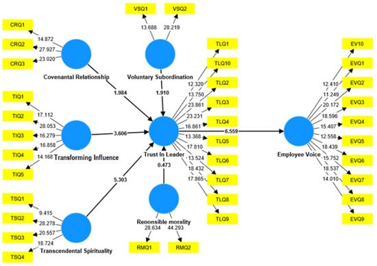 T-Statistic Value (own study). Note: VS = Voluntary Subordination, CR = Covenantal Relationship, TI = Transforming Influence, RM = Responsible Morality, TS = Transcendental Spirituality, TL = Trust in Leader, EV = Employee Voice.