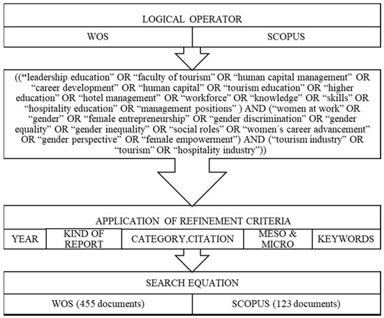 This study is based on a quantitative approach, utilizing high-prestige and high-quality databases such as WOS and Scopus to explore the presence of female human capital in the tourism sector. The selection of these databases was justified by their high standards in terms of the quality and prestige of scientific publications (Campina-López et al., 2024; Sánchez-Teba et al., 2021; Quispe Fernández et al., 2024). The data collection process was configured using logical operators to ensure meaningful and reliable results. Three key terms were used, linked by the logical operator “AND”: human capital, gender, and tourism. Additionally, to include related aspects and broaden the search, alternative terms were used, linked through the “OR” operator, such as “leadership education” or “human capital management”, in the human capital area. This methodology was applied in both WOS and Scopus, configuring the logical operators consistently across both databases (Figure 1).