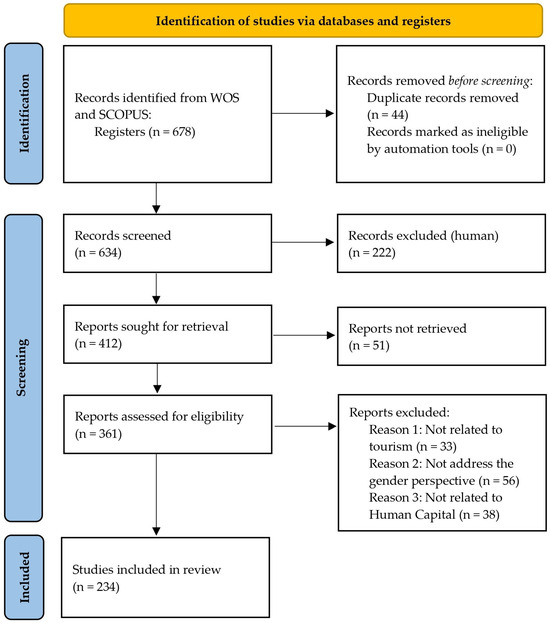After data collection, a synthesis process was carried out, consolidating information from both databases, removing duplicates, and consolidating relevant articles. This resulted in a total of 234 articles being selected for analysis. Regarding the description and refinement of the search, specific inclusion and exclusion criteria were applied, focusing on articles published since 2020 to study the current patterns. Additionally, the results were manually filtered to ensure that only articles directly related to the research topic were included. Finally, a comparison process was conducted between the results obtained from WOS and Scopus, analyzing trends in publication and the topics addressed regarding female human capital in tourism. This comparative analysis allowed for the identification of key patterns and gaps in the existing literature on the topic.