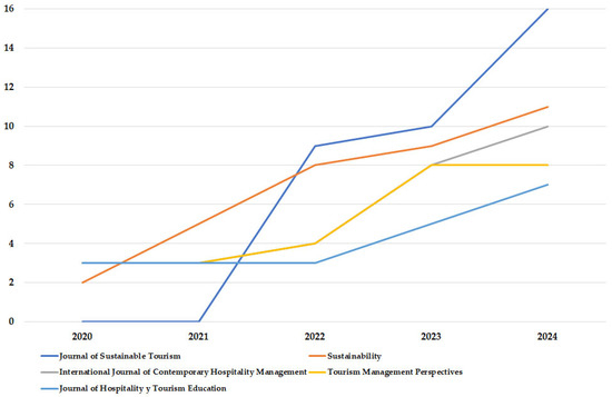 To complete the information provided by Bradford’s Law, Figure 4 shows the dynamics of the production of the journals considered the most relevant in the field of study in these four years. The Journal of Sustainable Tourism begins the annual series without any publication with respect to the area of knowledge studied, but begins to experience exponential growth between 2021 and 2022, and continues to grow to become not only one of the most relevant journals, but also the one with the highest volume of production. While it is true that Sustainability is presented as a journal positioned in the highest position in terms of citation frequency, its trajectory in the production of articles on the subject, begins to stand out in 2022. The International Journal of Contemporary Hospitality Management and Tourism Management Perspectives present a stable and parallel evolution in the first year observed and, in 2022, they begin to separate their trajectory. International Journal of Contemporary Hospitality Management grows further to be the third most publishing journal in 2024. Tourism Management Perspectives shows a linear progress; the first year, 2020, shows an upward trend, but then it is quite constant in the number of publications. The highest production peaks for these journals occur in 2024, except for Tourism Management Perspectives, which reaches it in 2023.