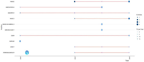 The impact indicator of scientific production is determined by the intensity of the color of the circle—the greater the intensity the greater the impact; therefore, the highest number of citations corresponds to E. Yang, with 15 citations in the year 2022 and 10 in 2024, followed by K. Dashper with a total of 17.2 citations for the selected period, and by C. Khoo, whose work was cited 1 time in 2022 and 10 times in 2024.
