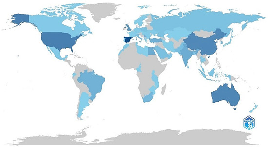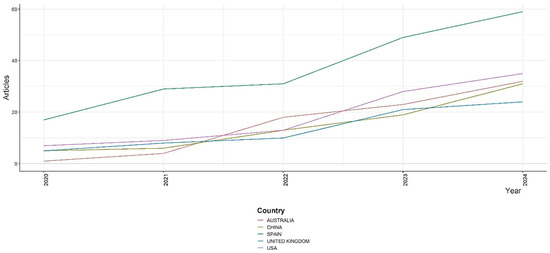 Figure 7 and Figure 8 represent scientific activity worldwide. Thus, the countries with the highest production between 2020 and 2024 for these fields of study (human capital, tourism, and gender) are Spain, the United States (hereafter USA), Australia, China, and the United Kingdom. The scientific progression is not linear. Spain is at the forefront, presenting the highest number of publications (185) over the entire period and with exponential growth between 2023 and 2024, followed by the USA (92 publications, p. onwards) and Australia (78 p.), countries that alternate in second place, although Australia only overtakes the USA in 2022 (18 p. vs. 13 p. American) and the USA takes the lead again in 2023 (28 p. vs. 23 p. Australian). The same is true for China (74 p.) and the UK (68 p.), which occupy the lowest positions in the ranking. It is worth noting Spain’s distance from the rest of the countries.
