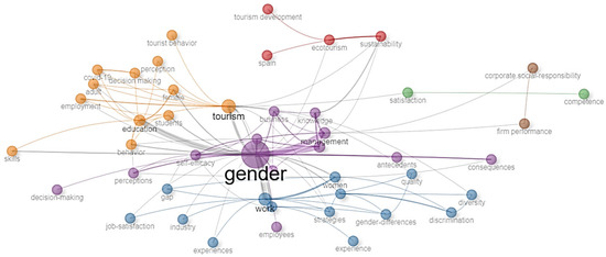The co-occurrence network presented in Figure 11 shows the presence of seven interconnected clusters governed mainly by the terms gender, work, tourism, sustainability, corporate social responsibility (CSR) and competition. On the one hand, and in purple, the concept of gender is represented, which is densely linked to knowledge, management, self-efficacy, perceptions, business, decision making, antecedents and consequences. In blue, there is another set linked to the concept of work and alluding to the following terms: women, strategies, gender differences, diversity, discrimination, job satisfaction, gap, industry, and experiences. As for the concept of tourism, it seems that two distinct clusters appear: on the one hand, there is the set represented by orange, which includes terms such as education, behavior, employment, skills, etc., and separately there is the red group, which includes concepts such as sustainability, ecotourism, tourism development, and Spain. Finally, the sets with the lowest number of terms are green and brown, which encompass the words satisfaction, competence, company performance, and CSR.