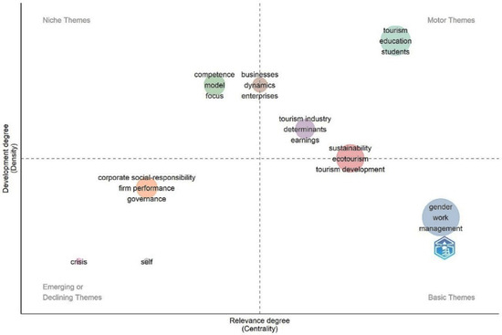 Figure 12 is divided into quadrants. In the upper right quadrant, the driving themes—tourism, education, and the student body—are positioned, indicating that they are well developed. These themes can be considered as key drivers in relation to human capital, the tourism sector, and gender.