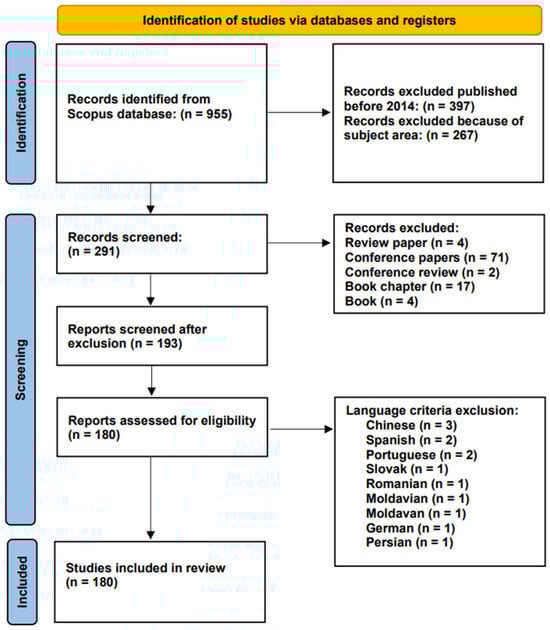 Exclusion criteria: We identified a total of 955 documents from the Scopus database based on our search query. In the identification stage, we excluded 398 papers published before 2014. Furthermore, 267 papers in the subject areas of engineering, computer science, environmental science, energy, medicine, art and humanities, mathematics, material science, earth and planetary sciences, chemical engineering, biochemistry, genetics, and molecular biology, agricultural and biological sciences, and neuroscience were excluded (see Appendix A). Furthermore, in the screening stage, we ended up with 291 papers, from which we excluded 4 review papers, 4 conference reviews, 71 conference papers, 4 books, and 17 book chapters because we were interested in comprehensively reviewing the empirical studies on the topic. Moreover, we excluded a total of 13 papers in Chinese, Spanish, Portuguese, Slovak, Romanian, Moldovan, German, and Persian; this is further displayed in Figure 1, as we were interested in evaluating the English literature.