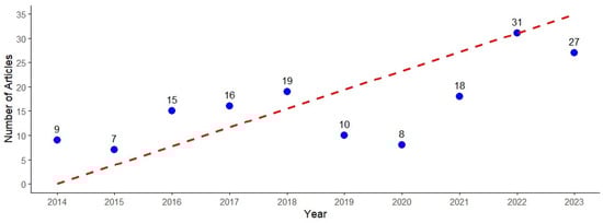 Figure 2 illustrates the number of articles published annually from the year 2014 to 2024. The x-axis represents the years, while the y-axis shows the number of articles produced annually during these years, with a value ranging from 10 to 30. The red line represents the progression of the scientific work over the respective years, meanwhile the blue dots show the number of articles with the corresponding year. The figure indicates that the highest number of articles was published in 2022, with 31 articles, and the lowest number was in 2015, with 7 articles. Over these years, there have been clear fluctuations of increases and decreases, but with an overall upward trend, which suggests a growing interest in the research topic. We can see a significant increase in publications after 2020, peaking in 2022. Meanwhile, 2023 saw a slight decline in comparison with 2022. Fluctuations in various years can be influenced by external factors, such as COVID-19 in 2020.