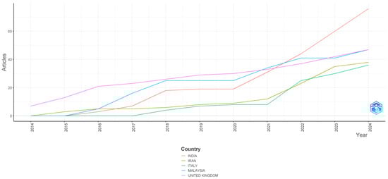 Furthermore, Figure 3 illustrates the number of articles published by countries from the year 2014 to 2024. The graph suggests that India, Iran, Italy, Malaysia, and the United Kingdom dominate scholarly work. In addition, India shows a steady increase from 2014 to 2020, followed by significant increases from 2020 to 2024, which correlates with the post-COVID-19 period. Similar patterns are evident in Iran, Italy, Malaysia, and the United Kingdom.