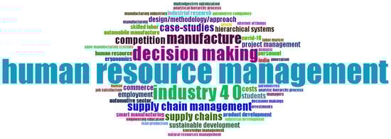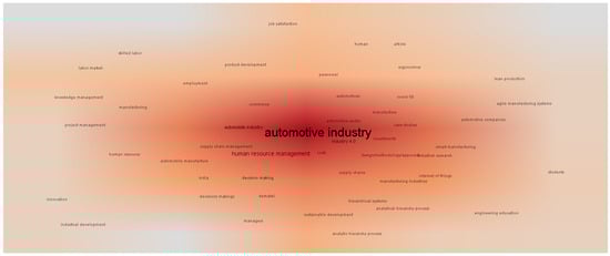 Figure 4 represents the keywords and the topics, where the size of each word indicates its importance and the frequency with which scholars use them. Meanwhile, Figure 5 shows the density of the keywords, where the intense color represents the greatest focus of scholarly work. Both Figure 4 and Figure 5 display that “human resource management” is the largest word, followed by the keywords “Industry 4.0” and “decision making”. This is because human resource management can be influenced by Industry 4.0 and can also influence decision-making. Where the coordination of “employment”, “engineering education”, “knowledge management”, “project management”, “personnel”, innovation”, “skilled labor”, “labor market”, “job satisfaction”, etc., is essential for the functioning of the center of the automotive industry, as displayed by the keywords “supply chain management”, “supply chains”, “manufacture”, “competition”, “smart manufacturing”, “commerce”. Figure 5 shows in detail the interconnection between these keywords.