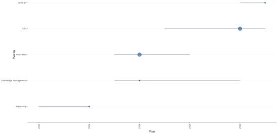 From 2014 to 2016, scholars showed interest in the topic “leadership”, emphasizing the need for transformational leadership, digital leadership, and leadership in crisis management which is further supported by the trends over the years with keywords like “innovations”, “knowledge management”, “skills”, and “COVID-19”. During the period from 2017 to 2022, “knowledge management” also emerged as a specific trend, highlighting the integration of knowledge sharing in Industry 4.0. In the years 2017 to 2019, scholars paid attention to “innovation” due to technological advancement, reaching a peak of research in 2018 because of AI, IoT, blockchain, and startup ecosystem developments. Between the years 2019 and 2024, topics like “skills” began to gain traction, highlighting the importance of digital upskilling needs influenced by Industry 4.0, technological advancements, and the COVID-19 pandemic. As presented in Figure 6, in the year 2023, researchers showed interest in the “COVID-19” topic from 2022 to 2024, exploring the pandemic’s impact on remote work, business workforce, resilience strategies, and education.