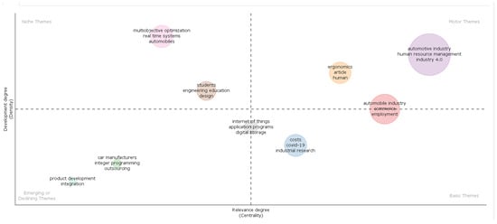Motor theme clusters are “ergonomics, article, human” and “automotive industry, human resource management, Industry 4.0”. Topics related to the automotive industry, HRM, and Industry 4.0 are the principal subjects and drivers for scholarly work. Meanwhile, the topic of ergonomics has shown a degree of development and relevance due to human-centered research, often connected to workplace safety, productivity, and well-being. On the other hand, the cluster “automobile industry, commerce, employment” is highly relevant and well developed because of HR’s interest in the direct employment impact on sales, marketing, and commerce resulting from global supply chains, market growth, and fluctuations, etc.