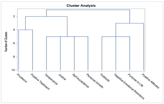 To identify patterns that reveal previously not considered hierarchical relationships among the different test dimensions, a cluster analysis was conducted to confirm that the model contained accurate variables for achieving a reasonable fit quality. In this sense, Table 2 shows the PROC CLUSTER syntaxis process. The clusters are the following: fortitude, negative reactions, life purpose (Cluster 1); temperance, justice, self-acceptance and personal growth (Cluster 2); positive treatment (Cluster 3); positive attitude (Cluster 4); and prudence (Cluster 5). In this analytical context, it should be noted that the last three clusters are formed by a single dimension, showing high independence and low error variance in the relationship hierarchical model. In other words, the model allows for operationalization, which in virtuous leadership (Ronda-Zuloaga, 2024) is expressed as a behavioral structure within organizations that is based on trust (conjunction of Clusters 5, 4, and 3) to obtain results (Clusters 2 and 1) as prudence (decision-making), positive attitudes (favorable disposition towards others), and positive treatment (display of positive attitudes), highly influence self-control behavior (temperance), equal treatment (justice), comprehensive development of individuals (self-acceptance and personal growth), negative emotional reactions (unfavorable attitudes) and life goals (life purpose).