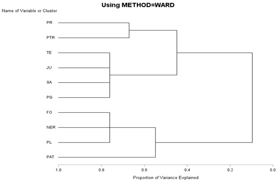In turn, in terms of visual inspection, Figure 1 shows that the hierarchical organization of the variables regrouped into five clusters is the one that reaches an explained variance of 75%, which the empirical literature recommends for operationalizing variables or groups of variables in models (O’Rourke & Hatcher, 2013).
