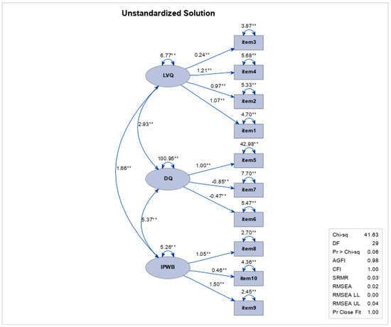 Path diagram for the first-order factorial analysis of the model of the virtue-based ethical leadership, affective reactions towards people with disabilities in the workplace, and intrinsic psychological well-being in a sample of work and organizational psychologists and people in leadership functions. Legend: LVQ (Factor 1); DQ (Factor 2); IPWB (Factor 3); ** Statistically significant at the 0.01 level (p < 0.01).