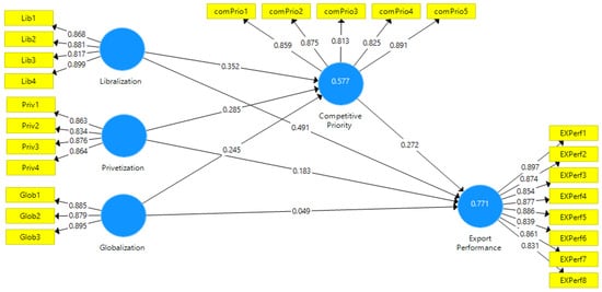 A normalized word with a range of 0 to 1 is the coefficient of determination. In order to evaluate the study’s hypotheses and demonstrate how globalization, privatization, and liberalization affect competitive priority and export performance, structural analysis and the information in Figure 3 were used.