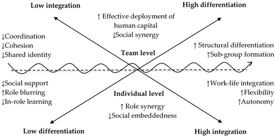 As our key theoretical contribution, we integrate paradox theory, differentiation–integration theory, and psychological needs theory and argue that hybrid work leads to opposing dynamics at individual and team levels of analysis, which create paradoxical tensions. Based on the focus group discussions, hybrid work has differential effects depending on the level of analysis. At the individual level, hybrid work is associated with decreased differentiation across roles, which hinders balanced need satisfaction as the relational and competence needs of employees are less satisfied. At the same time, hybrid work facilitates the integration of work and family roles, as these boundaries become more blurred while working from home. At the team level, hybrid work increases structural differentiation, enabling teams to better use their human resources depending on location and ensuring an adequate fit between task and technological affordances. However, hybrid work also hinders integration across team roles, being associated with coordination and communication difficulties.